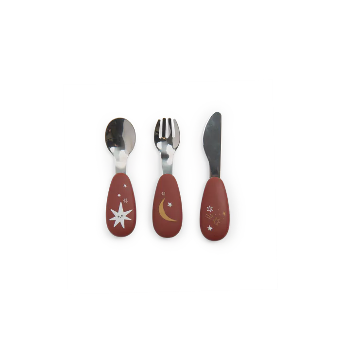 Set de 3 couverts en inox et silicone pour une bonne prise main pour manger comme les grands ! Ils sont joliment illustrés aux couleurs de la collection Après la Pluie